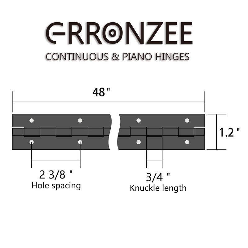 - 【48" Black Piano Hinge】Package Includes 1pcs 48in continuous hinge, It includes screws, and there are 2 3/8 in. spacings between each screw hole. Each knuckle of continuous hinge is a load-bearing point, providing uniform strength and smooth pivot action; friction-type pins won't fall out.