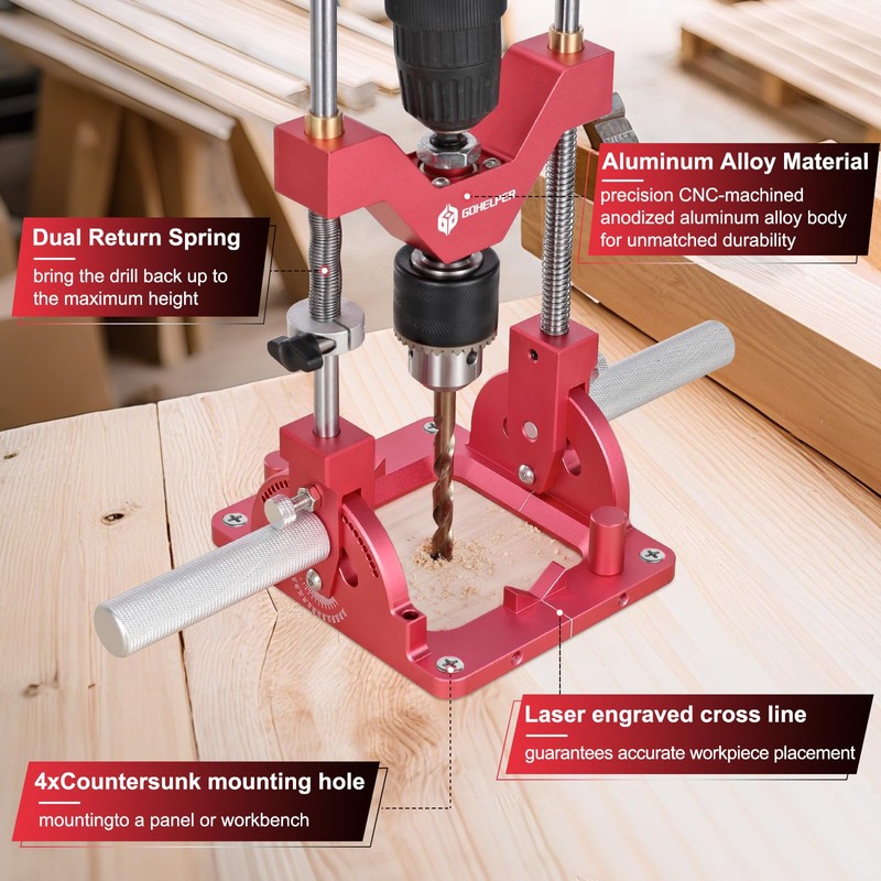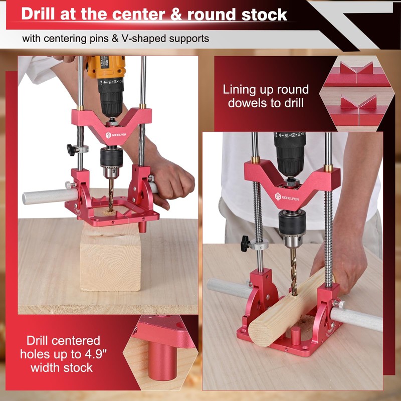 - Smart Engineering Features:Dual removable centering pins easily create centered holes in materials up to 4.9" wide. Integrated V-groove supports securely grip dowels, pipes, and tubing for stable, slip-free drilling. Dual tension springs instantly reset the drill to max height, simplifying bit changes and repetitive tasks.Four countersunk mounting holes secure the guide to workbenches or panels for hands-free operation