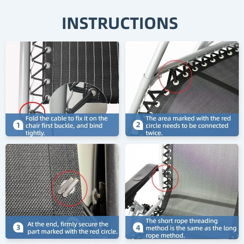 - 【Extra-Long Replacement Cords】Our zero gravity chair repair kit includes 2 longer cords (7.4feet) and 2 standard cords (4.9feet)—providing better coverage than most brands. The durable elastic ensures a secure fit for various chair types.