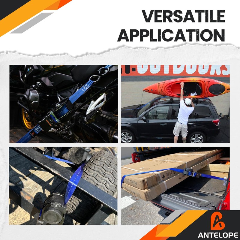 - Powerful 1500 LB Break Strength: ANTELOPE retractable tie down straps crafted with durable, rust resistant S hook and diamond stitching. With a remarkable 1,500 Lb Break Strength | 500 Lb Load Capacity, you can no worries to transport motorcycle or heavy loads