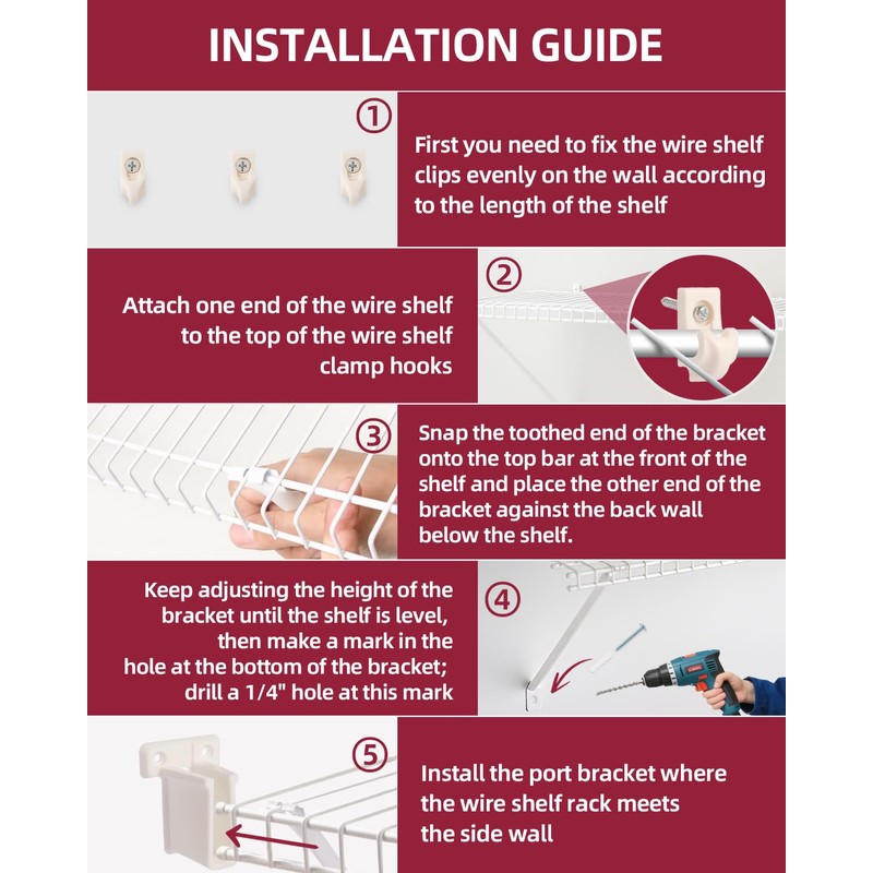 - All-in-One Package: Includes 4 wire shelf brackets, and 10 Wire Shelf Clips – everything to secure your shelving system instantly. No extra closet maid accessories needed!