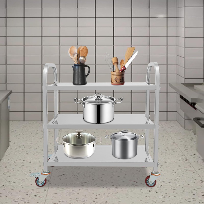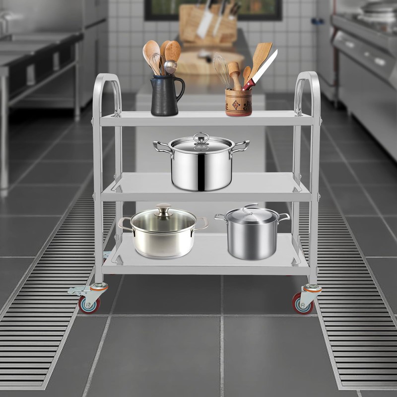 - Function: Three-layer stainless steel trolley helps you sort kitchenware or tableware, and the open design allows you to easily pick up and organize items. The convenient handle allows you to push the product easily. is suitable for laboratories, beauty salons, and even cans, hotels, office building kitchens, restaurants, homes, clubs, bars, cafes, and more.