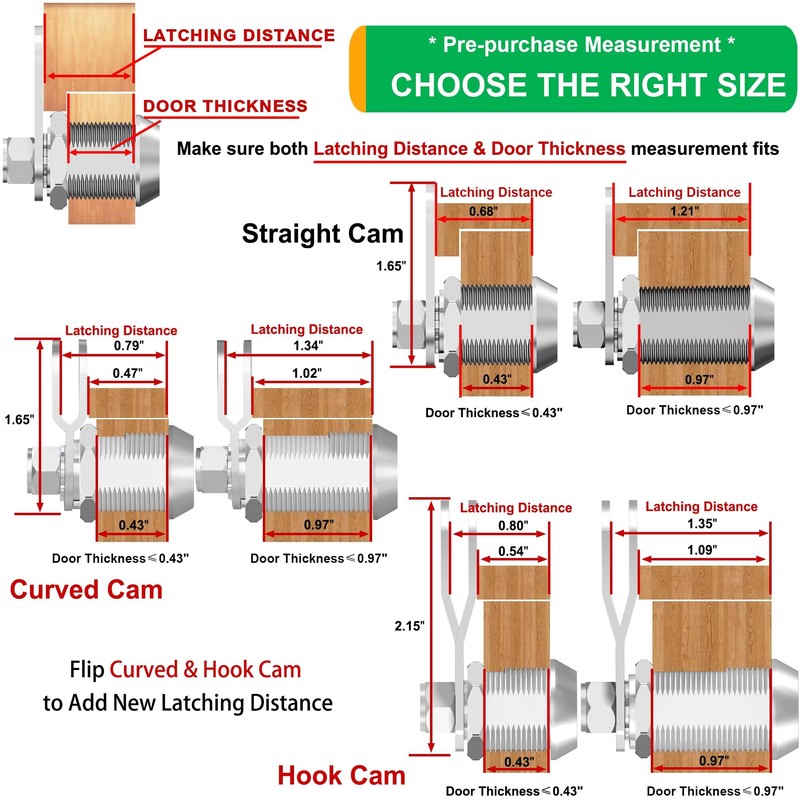 • 【Pre-Purchase Measurement Guide】 Before purchasing to Measure the latching distance (from the front of the door to the latch locking position) and door thickness (within the maximum length allowed by the CAM lock) , Make sure both measurement precise fits. Each lock comes with 3 types of latches (2.12" offset hook cam, 1.66" offset cam, 1.66" straight cam) to meet your different installation needs.