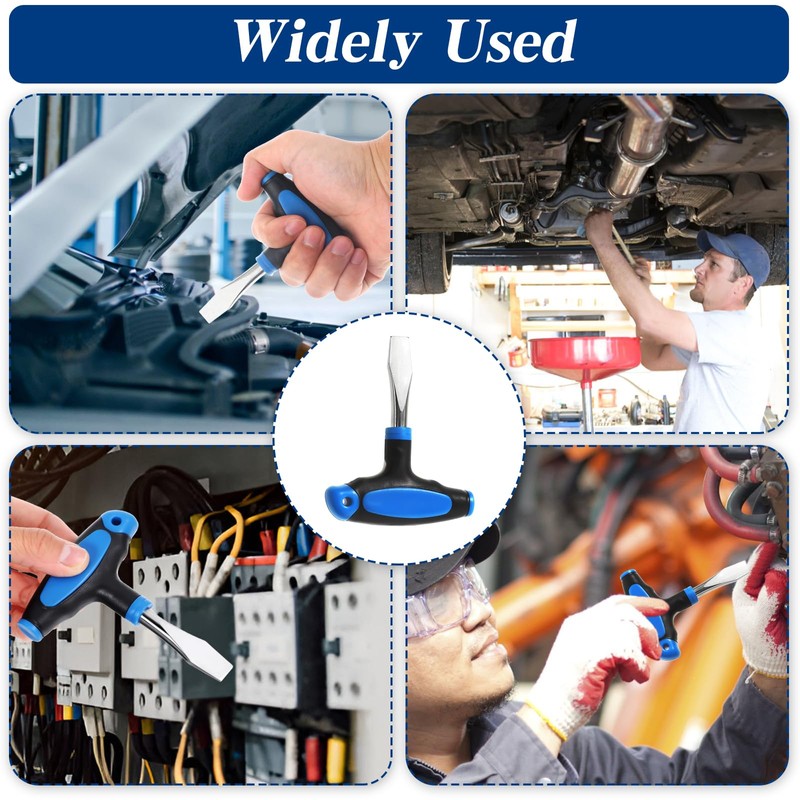 • Ergonomically Designed: This screwdriver adopts a T-handle design, which provides a non-slip and comfortable grip. Whether you use the driver for a long time or operate it with one hand, the flat screwdriver can reduce hand fatigue while achieving precise control. This design is not only suitable for professionals, but also for beginners, easily for everyone to use