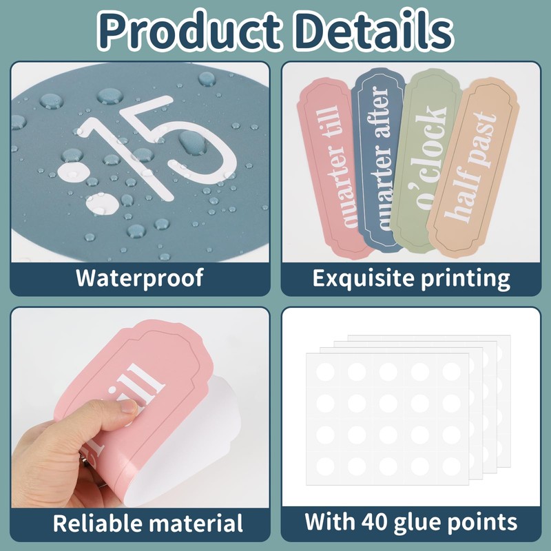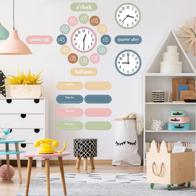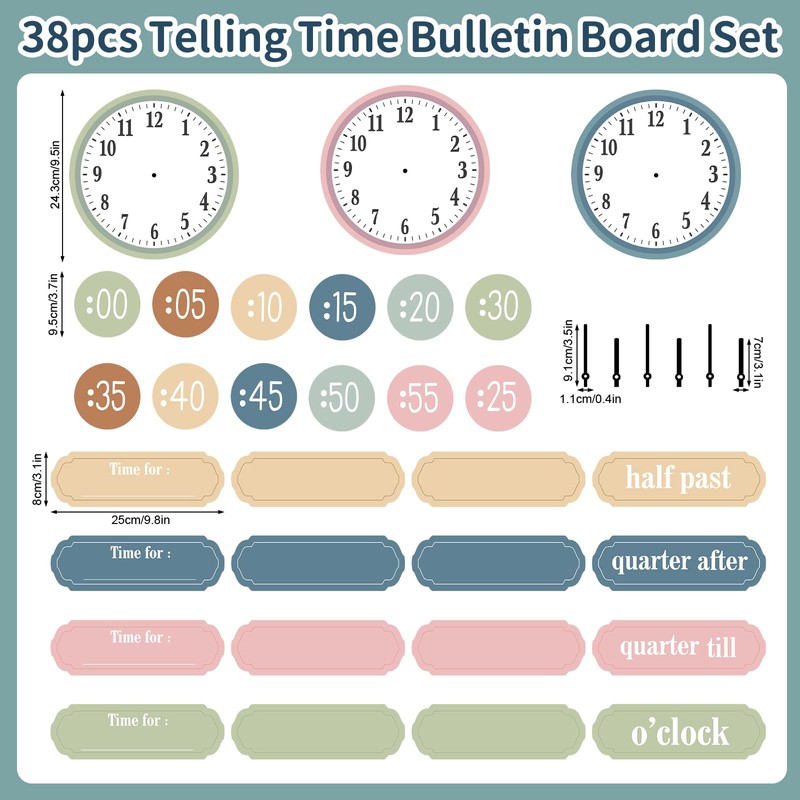 - What You Will Get: This telling time teaching clock for kids includes 37pcs cutouts, 3 minute hand arrow,3 hour hand arrow, 12 time labels, 4 time descriptions, 3 clocks and 4 "Time For" labels, 8 blank labels and come with 80pcs glue dots for easy setup.You can use the glue dots to stick the posters anywhere you want.Perfect classroom supplies for teachers elementary