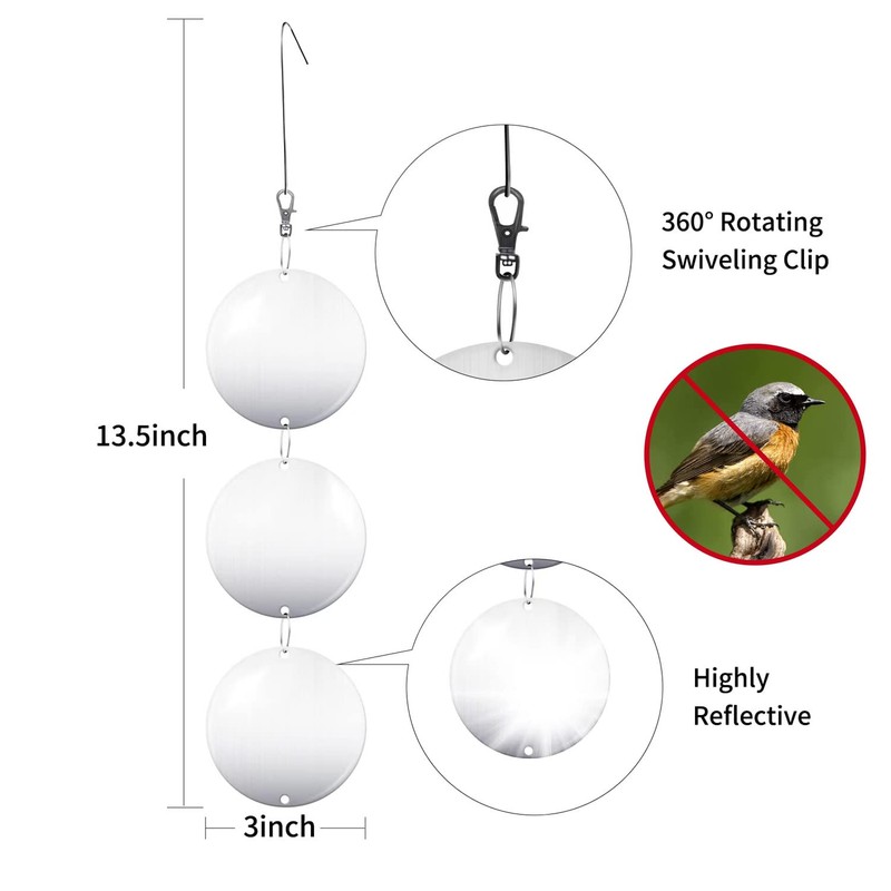 - Scare Birds Away - Featuring large 24 pcs Discs,this bird scare device maximizes its bird-scaring presence. The multi-faceted refraction points, combined with the motion from the wind, effectively scare away, confuse, and prevent woodpeckers, pigeon and other birds from becoming accustomed to the environment, with optimal results achieved in direct sunlight and a gentle breeze.
