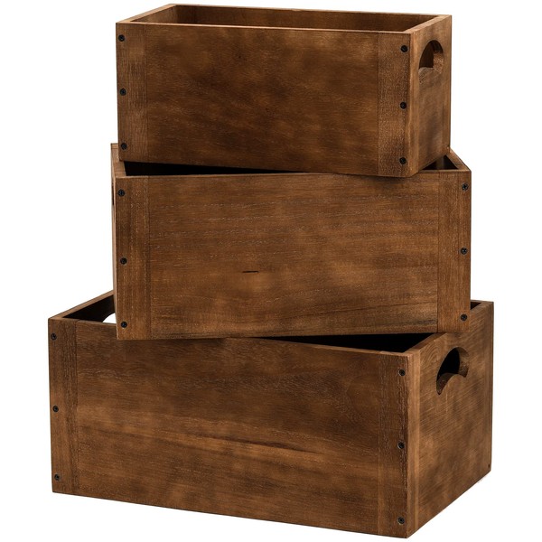 Hedume Set of 3 Nesting Wooden Crates, Wood Crate Box with Handle, Rustic Brown Decorative Wood Storage Crates Container, Stackable Cube Basket Bins Organizer for Home, Office, Closet, Shelf