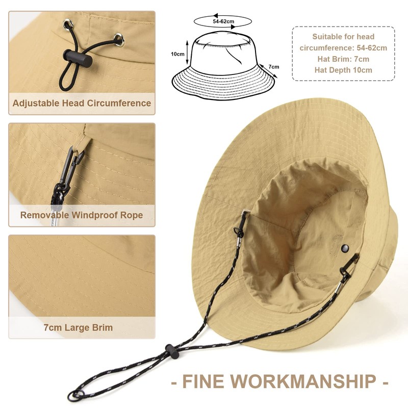 - ADJUSTABLE:The waterproof hat bucket hat has two places for adjustment, firstly there is an adjustment strap at the chin, and there is also an adjustment string at the hat brim, which can be adjusted according to your head size. Even in windy days, the fisherman hat can also be firmly fixed on your head. Fits head circumference 54-62CM teens, adult men and women.
