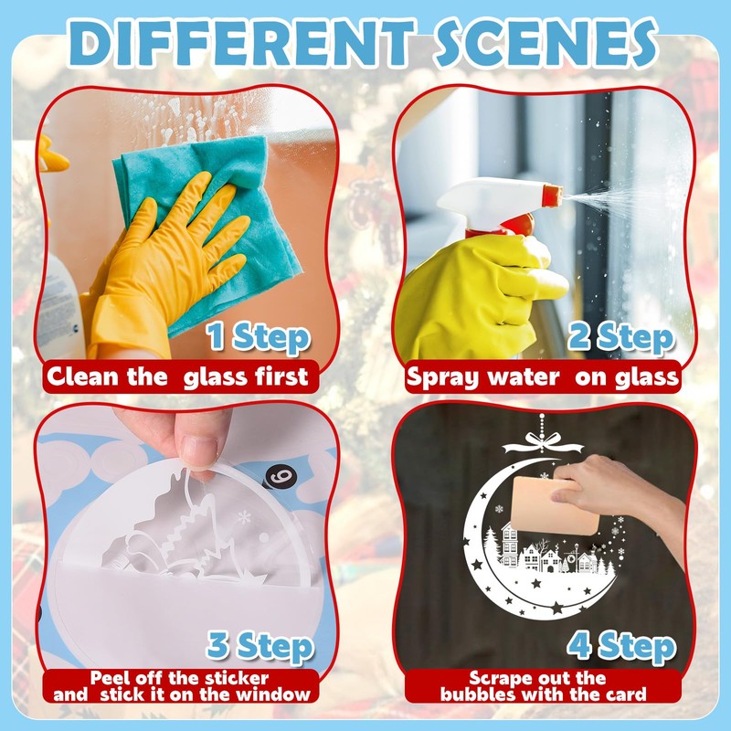- Widely Applicable Christams Decorations: Christmas window clings an be applied to any clean, smooth, flat surface for glass doors, windows, merchandise windows and many other places.
