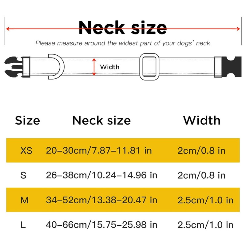 - Please note the size: XS - width 2 cm, neck size 20-30 cm, S - width 2 cm, neck size 26-38 cm, M - width 2.5 cm, neck size 34-52 cm, L - width 2.5 cm, neck size 40-66 cm. Your satisfaction is our first priority, if you encounter any problems during use, please contact us, we will reply you as soon as possible.