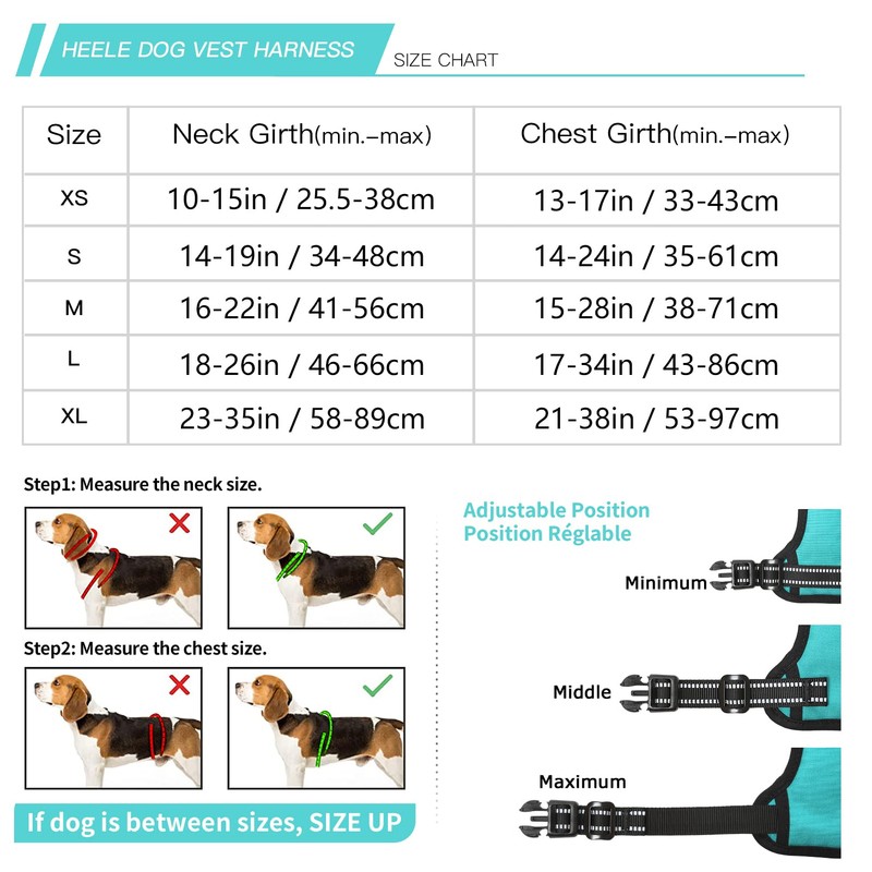 - Less Stress and Tension: If dog doesn't like a harness over head, this harness with a clip at neck and a quick press-to-release lock on the neck makes things easy and faster to put on and less stress for your pet. Size S: Neck 34-48cm/14-19in, Chest 35-61cm/14-24in.