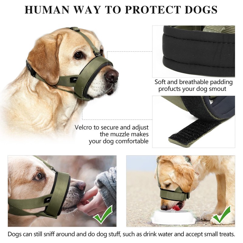HEELE Dog Muzzle with Head Strap and Adjustable Loop and Soft Neoprene Padding, No More Chafing, Muzzle for Medium Dogs to Prevent Barking Biting and Chewing, Gentle Dog Muzzles, Army Green, M