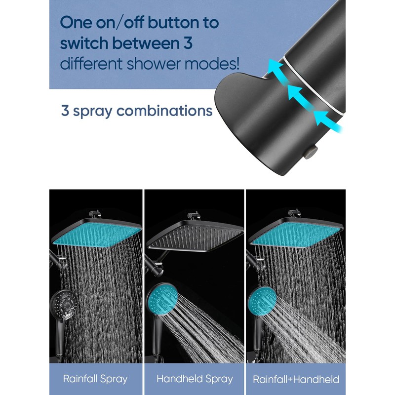 • 【12" Rain Shower Head】12" square stainless steel shower head + 8-mode shower head, large panel, allowing you to enjoy the perfect shower experience under the waterfall. The ball joint offering 360° rotation is made of brass. Compared to plastic ball joints on the market, our joints are stronger and do not crack or leak. Can be used in high pressure and high temperature environment.