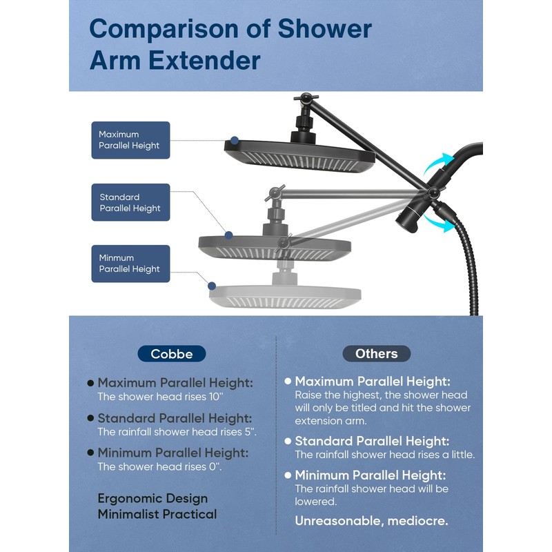 • 【Adjustable Extension Arm】Heemli shower arm is equipped with adjustable rotary ball connector, the height can be adjusted up and down, so that your large shower can be adjusted at any Angle, do not hit the shower arm, enjoy the luxury shower experience!