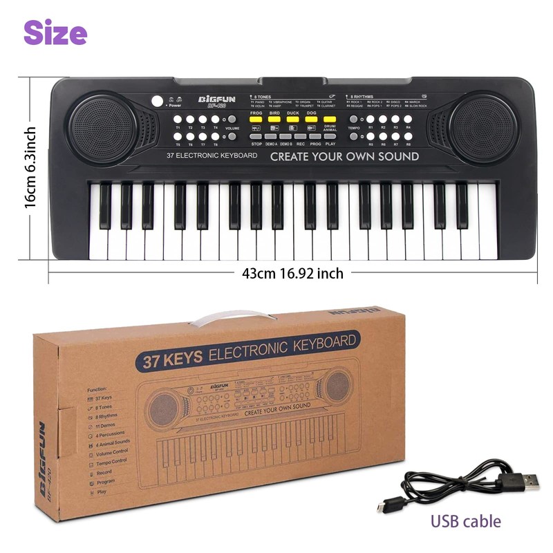 - 【MULTIFUNCTIONAL 37 KEYS PIANO】Piano playing function + record and playback function + 8 tones + 8 rhythms + 11 demos + 4 percussions + 4 animal sound + tempo control + volume control. Let your child explore different sound combinations and find more fun.