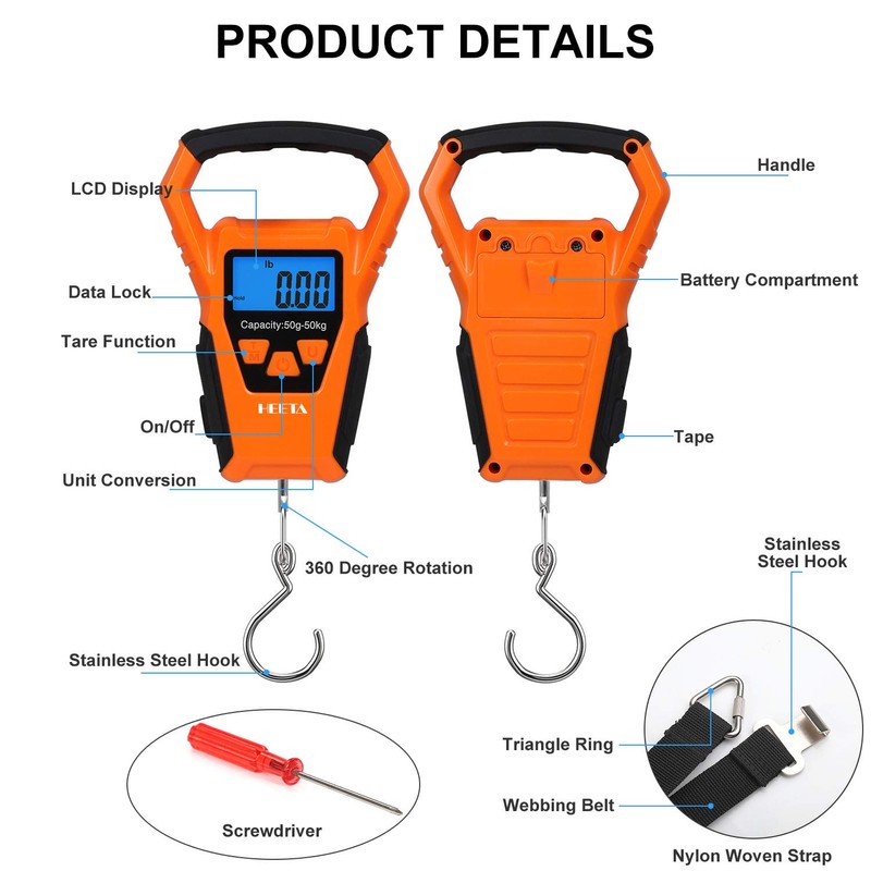- Easy to Use: Heeta portable digital scale with extra-wide soft plastic handle is easy for you to carry outdoors, and the blue LCD backlight with data locking makes you easy to read the value at day and night. The hanging scale is powered by 2 AAA batteries (included)