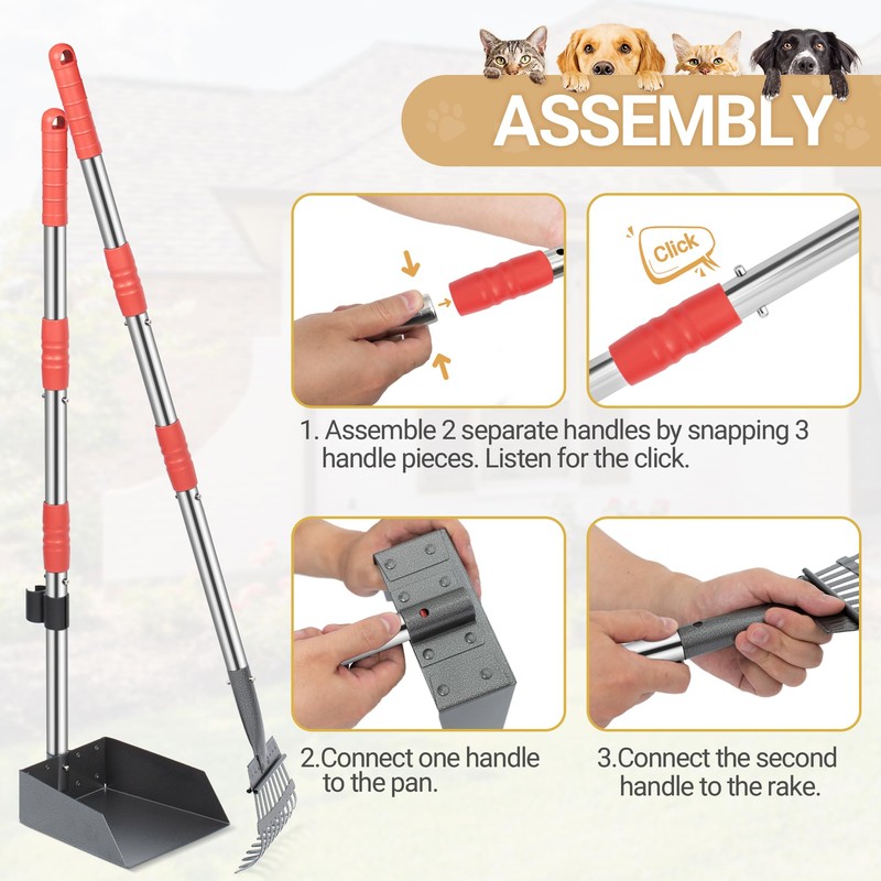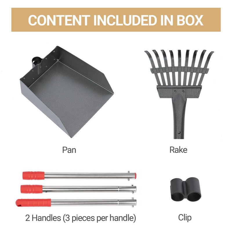 - Pooper Scooper Equipment in Pack: 1 tray and 1 rake kit meet almost all the needs of using. The size is over 37 inches, you need not bend over when clean pet poop.