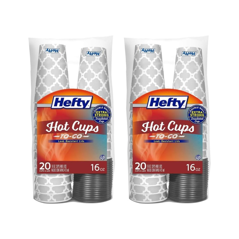 Hefty Disposable Hot Cups with Lids are made stylish and strong, with a patented double wall design to keep heat in so that your beverages stay hotter, longer. These disposable 16 ounce coffee cups with lids are perfect to take your tea or coffee on the go, and they fit in cup holders and most single-serve coffee machines. The leak-resistant lid helps prevent spills and leaks, so you don't have to worry about a mess during your busy day. The elegant gray and white lattice design makes these coffee cups an attractive and convenient choice; perfect for adding a touch of something special to your everyday. Start your morning Hefty strong with these paper coffee cups with lids.