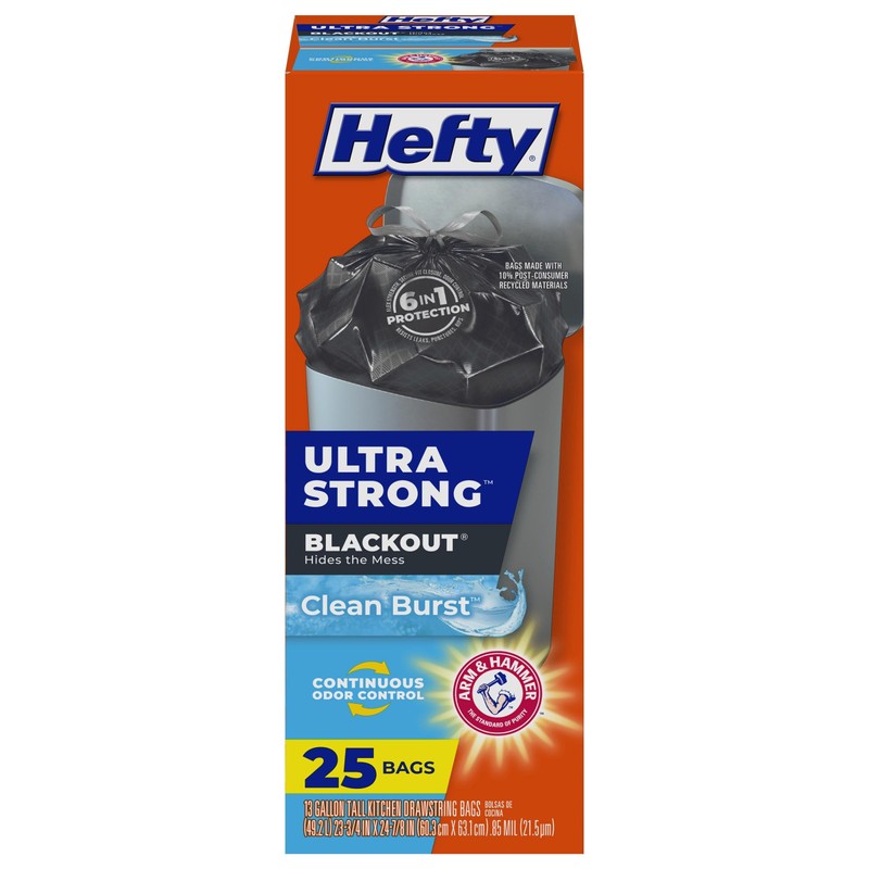 • 13 GALLON BLACKOUT GARBAGE BAGS—This package contains 25 Hefty Ultra Strong black, Clean Burst scented, 13 gallon kitchen trash bags