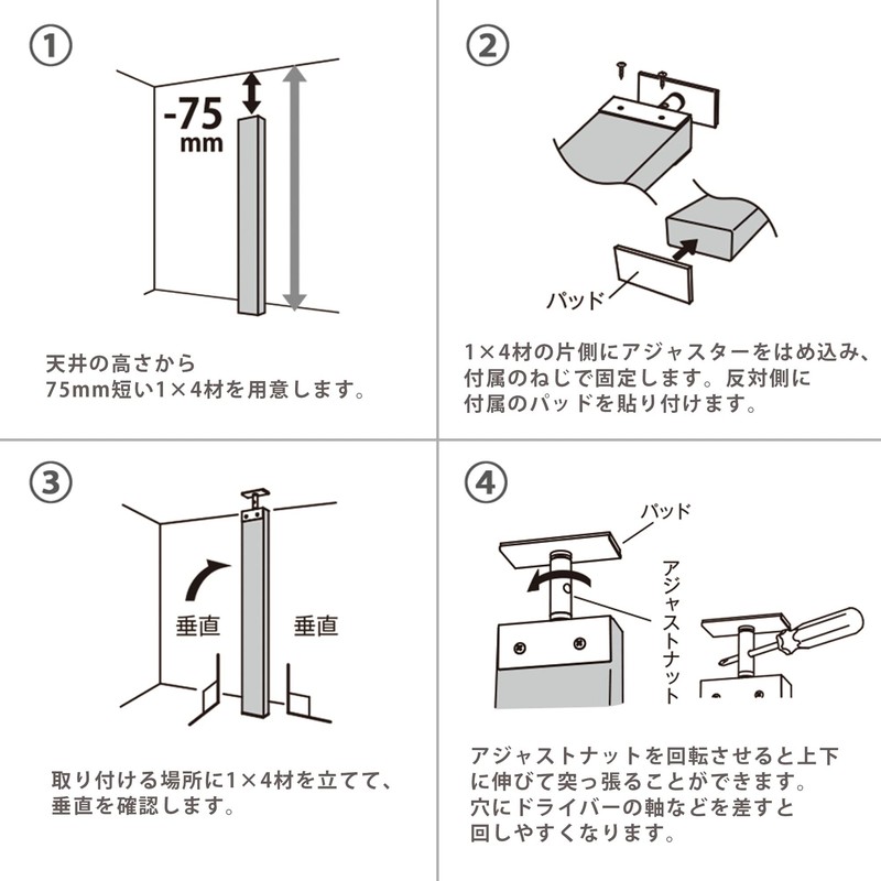 - Compatible woods: 1 x 4 wood; Mounting dimensions: Height up to 72.8 inches (1,850 mm); Wood cutting guide: Please prepare wood 3.0 inches (75 mm) shorter from the ceiling height
