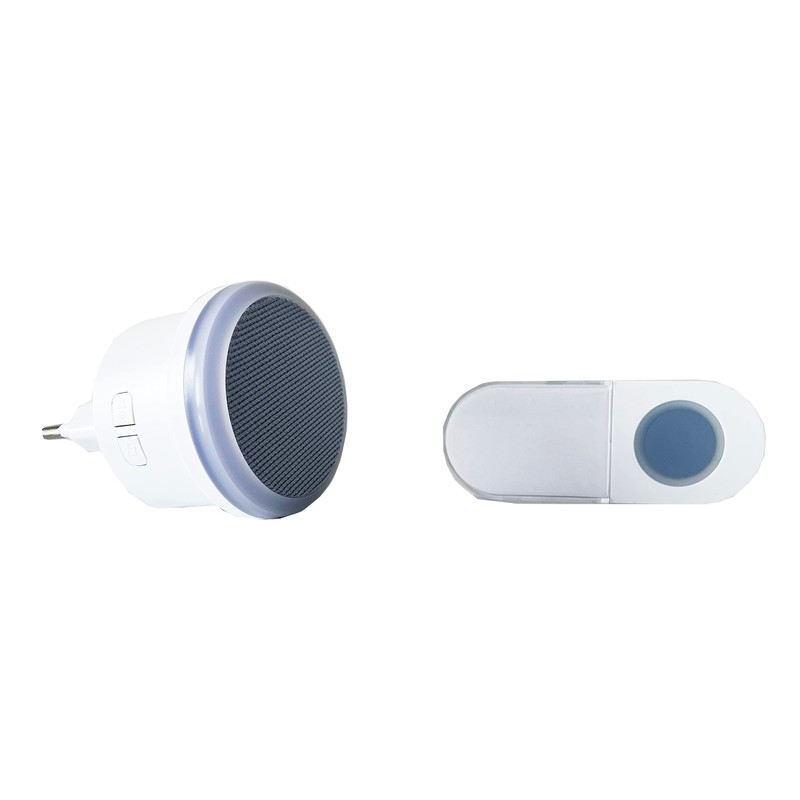 - Technical details: weatherproof transmitter IP 44 with name plate, receiver and transmitter pure white, with fabric cover, volume control in four levels up to approx. 80 dB (A), diameter 55 x 38 mm, transmitter 82 x 32 x 14 mm (H x W x D)