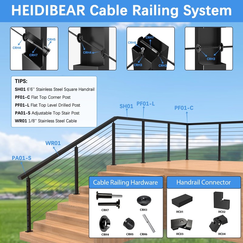 - Cable Railing System: To help you build a cost-effective cable railing system efficiently, we recommend the following combination of HEIDIBEAR products, including 1/8’’ stainless steel cable WR01, stainless steel handrail SH01, 36’’ flat top cable railing post PF01, 36’’ adjustable top cable railing post PA01. Visit our store or leave a message for more information