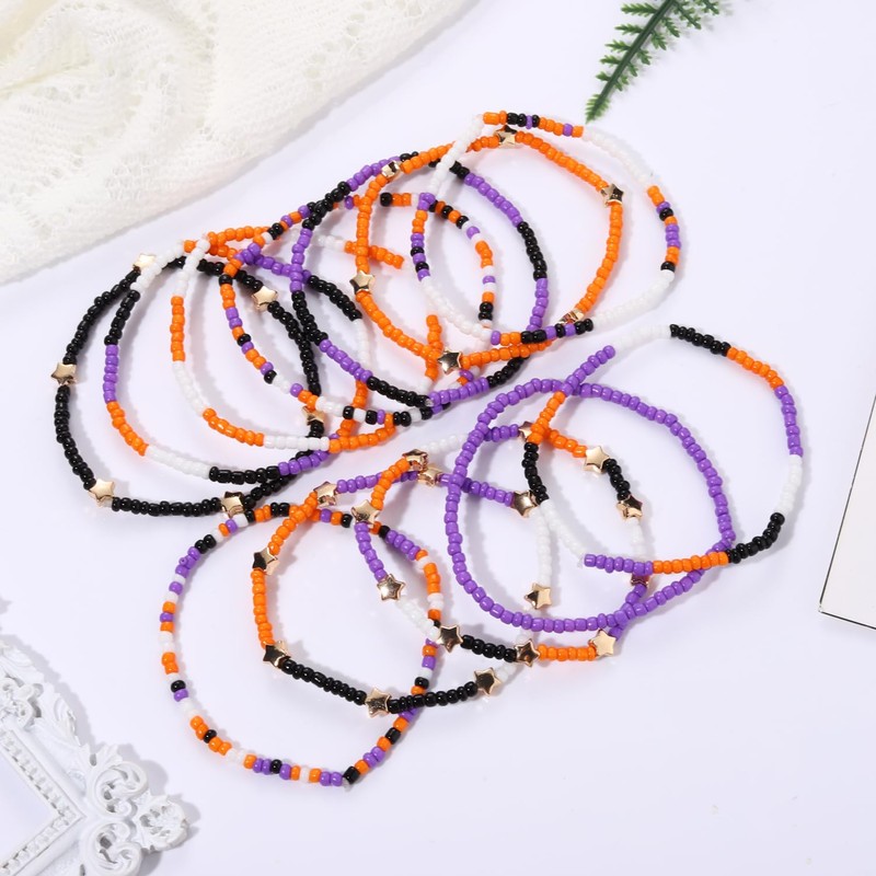 - ❥With a layered silhouette,the vibrant Halloween colors in this set of 12 black purple orange seed beaded bracelets certainly does the trick. Perfect for layering,they're strung with cute beads on elasticated rope.So spice up your Halloween costume look with these stylish stretch bracelets!
