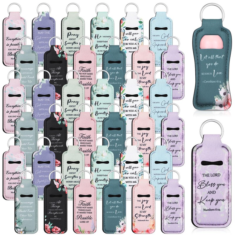 Heigble 36 Pcs Lipstick Holder Christian Key Chain Bulk Lip Balm Pouch with Metal Ring Religious Bible Gift(English)