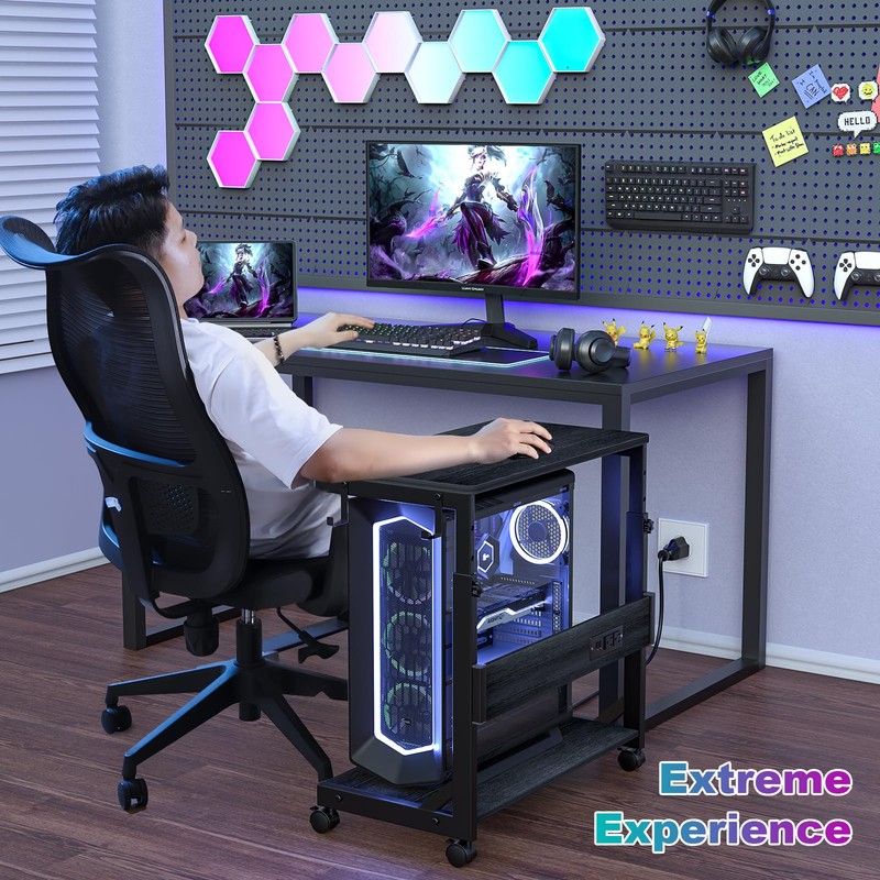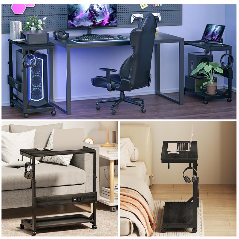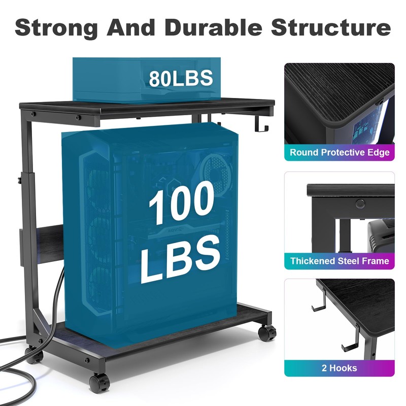 • Pc Tower Stand With Charging Station: This Mobile PC Standing with dual 120V/12A outlets and dual USB ports can power your laptop, smartphone, printer, tablet or any electronic device. Great for keeping an organized workspace. Plus, the PC Tower Rack doubles as a side table to provide additional power for your desk lamp