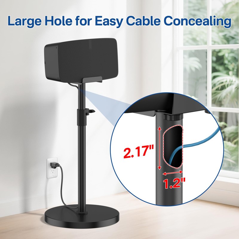 - Tidy Cable Management: The floor speaker stand for Sonos Five has reserved hole for speaker cables through the straight pole to keep messy wires organized. Say goodbye to cluttered cables and enjoy a sleek, minimalist setup.