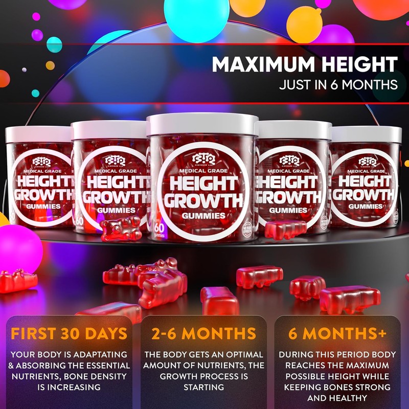 - Unlock your height potential- Achieve your dream height with our growth supplement, a gluten-free formula designed to boost bone growth and increase height. Maximize your growth potential with our height enhancer pills, packed with essential vitamins and minerals to support bone growth. Support your growth with our height gummies for kids, teens and adults. The blend contains perfectly balanced ingredients. Get healthy bone growth & strength with our natural product.