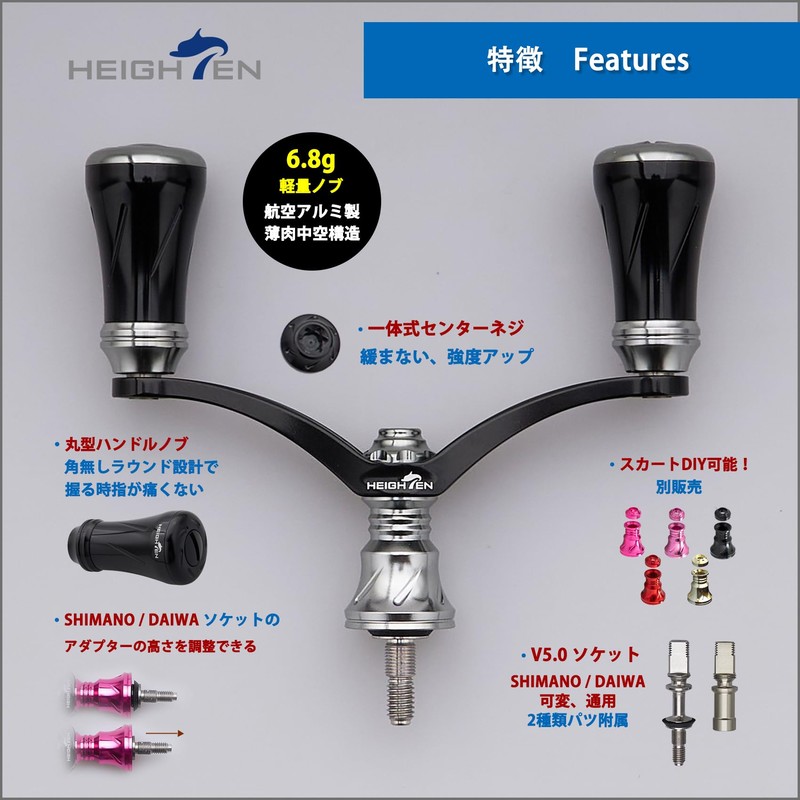 - Size: Handle shaft center distance 3.7 inches (95 mm) / 3.9 inches (98 mm), Knob diameter 0.8 inches (20 mm) / 0.7 inches (19 mm); Total weight: 1.3 oz (34 g) (for Daiwa / 1.3 oz (39 g) (for Shimano); Material: 70 series aircraft aluminum alloy