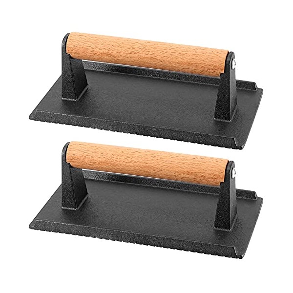 - WHAT YOU GET - You will get 2 cast iron grill press, which can match it with various cast iron frying pans and grills to add fun for cooking. Please wash in hand (no dishwasher) to avoid damage to the wood handle and putting it away in a dry place after washing