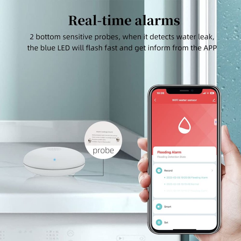 - Smarter: Unlike traditional water leak detectors, we not only come with 75db audible alarm and blue flashing reminder, we can realize APP notification by connecting wifi (2.4GHz Wi-Fi network ONLY).