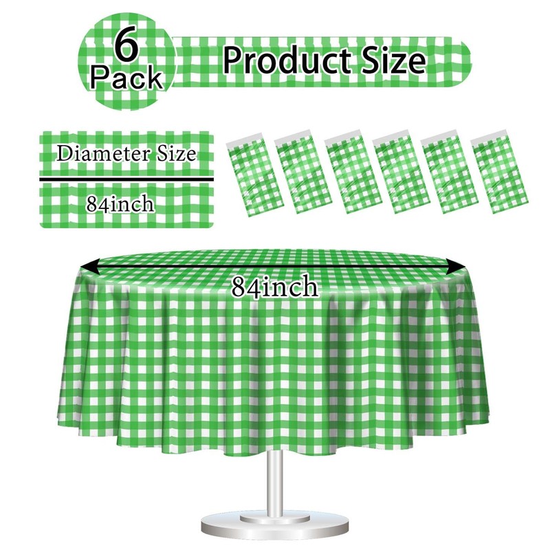- ABOUT OUR ROUND TABLECLOTH: Our round checkered tablecloth plastic is 84 x 84 inches, and it can be cut to the desired size. The green plastic table cloth is durable and wear-resistant. Green tablecloths for round tables are a great choice for indoor or outdoor party decoration