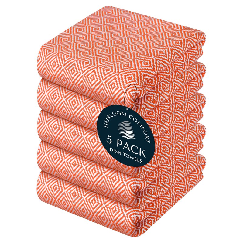 HEIRLOOM COMFORT Orange Kitchen Towels (5 Pack), 100% Cotton, Diamond Weave Towel Set, 16"x26", Super Absorbent & Durable Dish Cloths, Quick Drying Fabric for Drying Dishes, Everyday Kitchen Cleaning