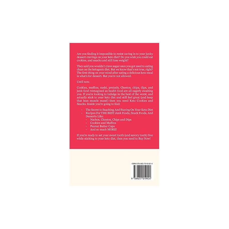 Are you finding it impossible to resist caving in to your junky dessert cravings on your keto diet? Do you wish you could eat cookies, and snacks and still lose weight?They said you wouldn't crave sugar once you got used to eating clean on the ketogenic diet. But we know that's not true, right? The first thing on your mind after eating a delicious keto meal is what's for dessert. But you're not allowed.Until now.Cookies, muffins, sushi, pretzels, Cheetos, chips, dips, and junk food reimagined as health food are all eagerly awaiting you. If you're looking to indulge in the best of the worst, and actually stick to your keto diet and still feel great (and keep that lean muscle mass!) then you need Keto Cookies and Snacks. Inside you're going to find:The Secret to Snacking And Staying On Your Keto DietRecipes For THE BEST Junk Foods, Snack Foods, And Desserts Like: Nachos, Cheetos, Chips and Dips Cookies and MuffinsPeanut Butter CupsAnd so much MORE!If you're ready to set your sweet tooth (and savory tooth) free while sticking to your keto diet, then you need to scroll back up and click Buy Now!