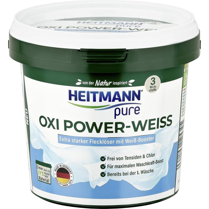 HEITMANN pure Oxi Power-Weiss ensures bright white laundry and reliably removes even stubborn stains, grey haze and unpleasant odours. The powerful stain and grease remover works deep in the fibres and makes your white laundry shine again - whether casual and work wear, towels, bed linen or baby and children's clothing.