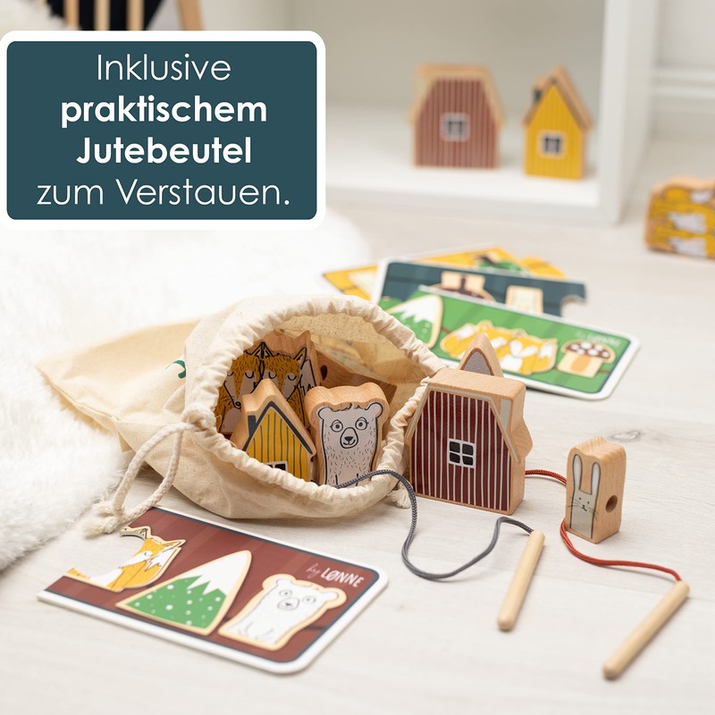 • Complete for love – lovingly designed wooden toy with story, threading game with 8 double-sided printed threading figures, including mini book, cotton bag and key ring, for children from 24 months