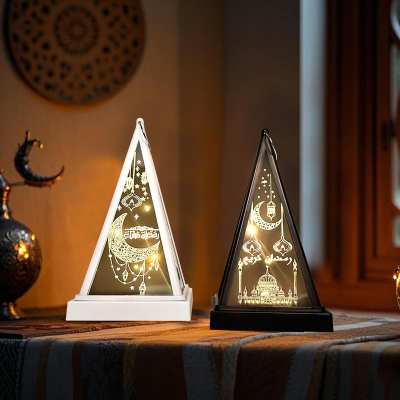 Hekasvm 2 Stck Ramadan Deko Laterne, Ramadan Dekoration LED Pyramide Lichter Ramadan Deko Tisch Muslim Islam Eid Ramadan Festival Dekorationen, Ramadan Geschenke (Wei?A+SchwarzA)