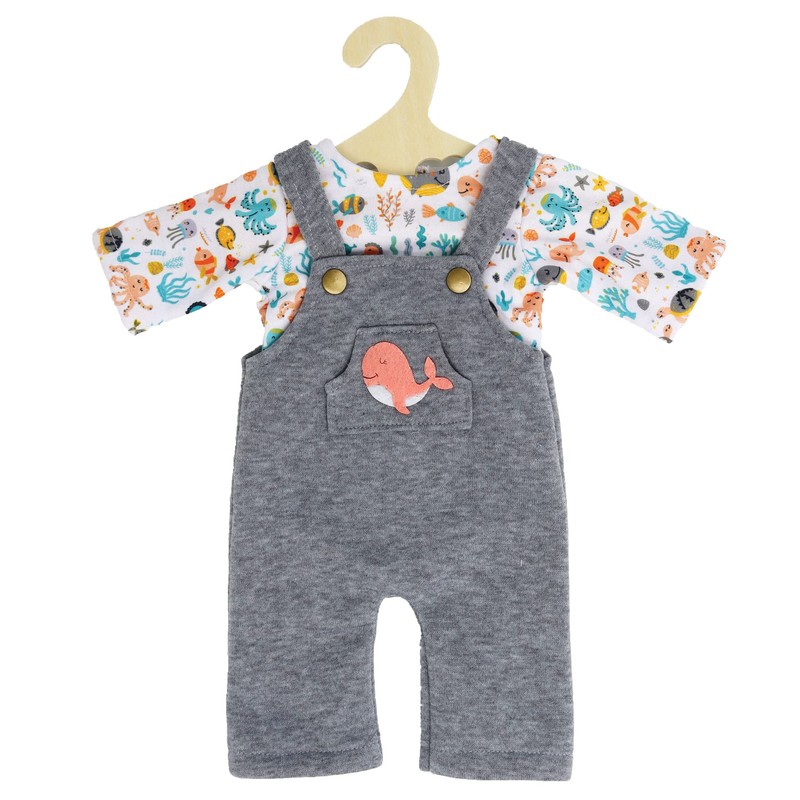 - Cute doll outfit in whale Bobby design consisting of a jersey shirt printed with ocean inhabitants and grey mottled dungarees with whale appliqué. The doll accessories come on a practical wooden hanger