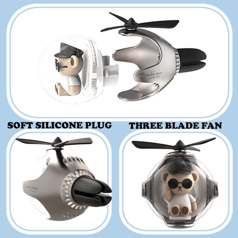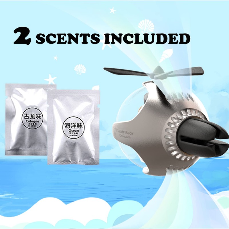 - The design of the car air fresheners is made in the style of a bear sitting in helicopter, which rotates the screw with the help of the air coming out of the deflector, which help the fragrance spreads to every corner of your car. The air coming out of the deflector makes the propeller blades move - it looks as impressive as possible. Despite the original design, the reusable air freshener does not distract the driver from the road and does not interfere with various actions.