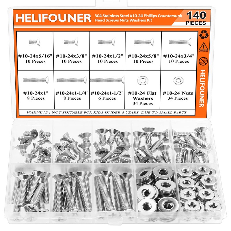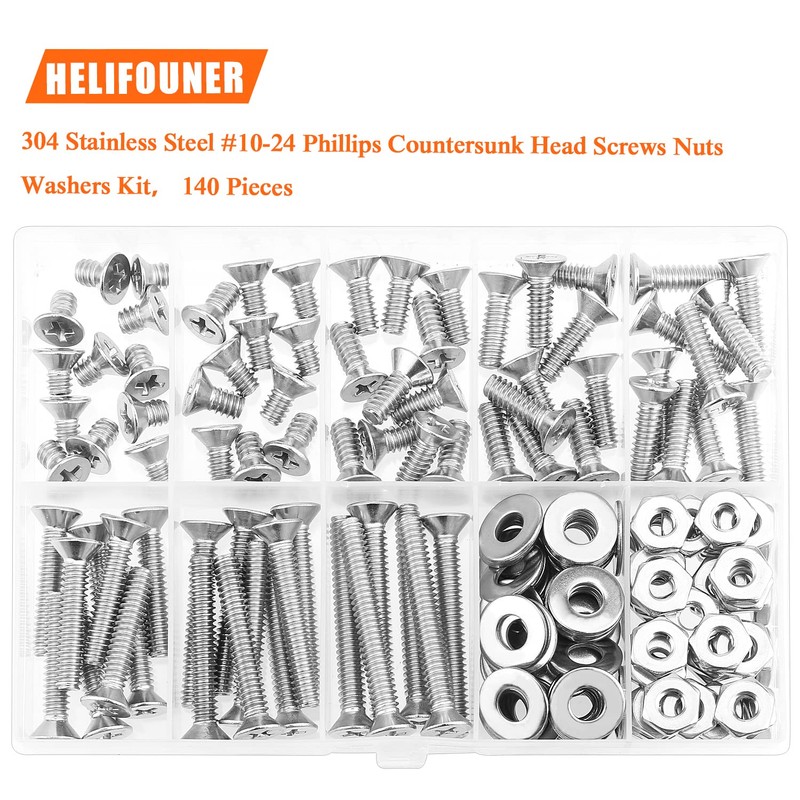 HELIFOUNER 140 Pieces #10-24 Phillips Countersunk Head Machine Screws Nuts Washers Assortment Kit, Coarse Thread, Fully Machine Threaded, 304 Stainless Steel