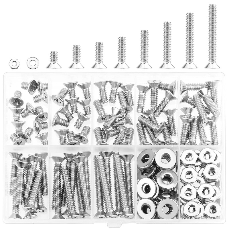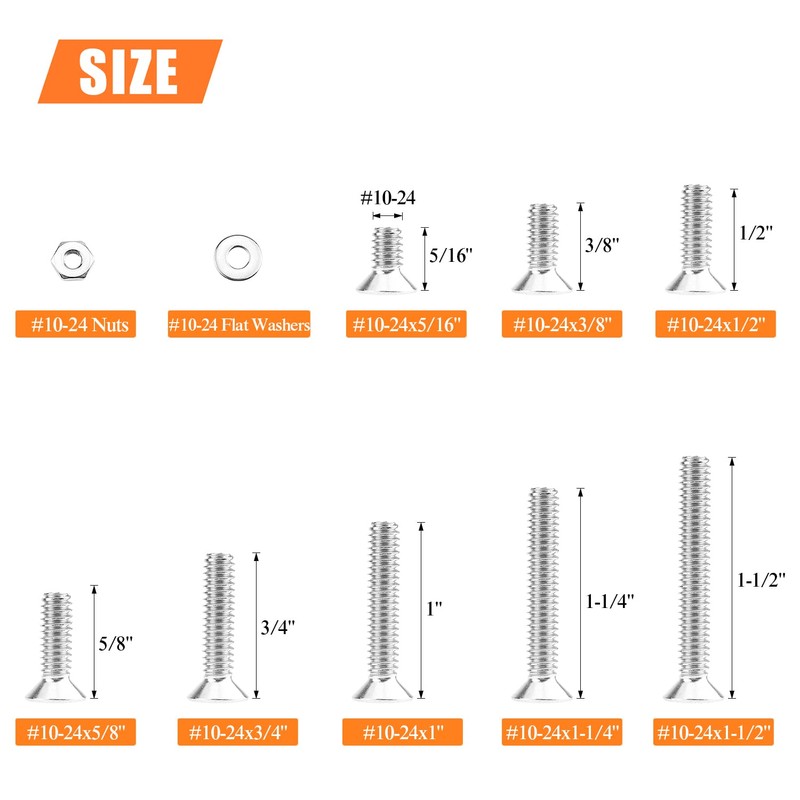 - 【Sizes】 #10-24x5/16", #10-24x3/8", #10-24x1/2", #10-24x5/8", #10-24x3/4", #10-24x1", #10-24x1-1/4", #10-24x1-1/2", phillips countersunk head machine screws with matching hex nuts, flat washers, , total 10 sizes, different sizes can meet your different needs.