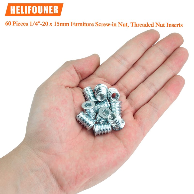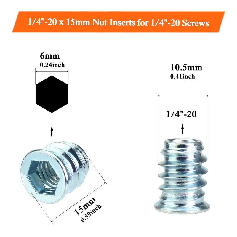 - Total 60 pieces 1/4-20 x 15mm threaded inserts are packed in an environment-friendly cardboard box, enough quantities can satisfy your long time using. Our threaded inserts have standard internal hex socket, without burr, smooth, non-slip, widely used for all kinds of composite materials, soft wood, plywood and hardwood.