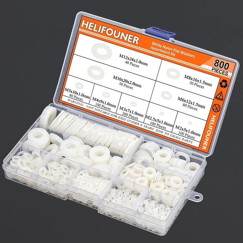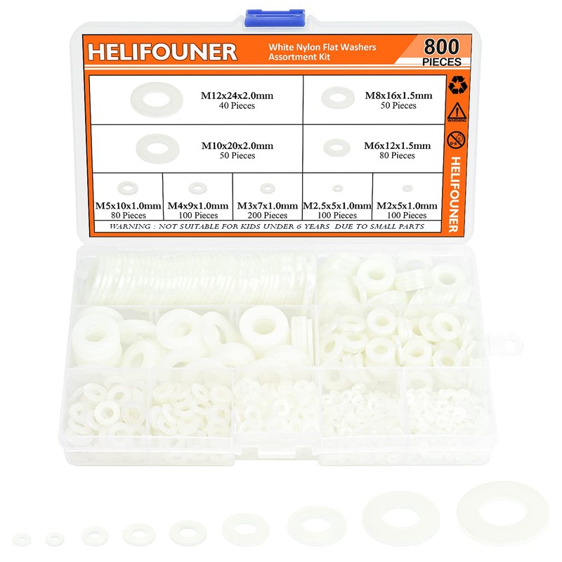 HELIFOUNER 800 Pieces 9 Sizes White Nylon Flat Washers.