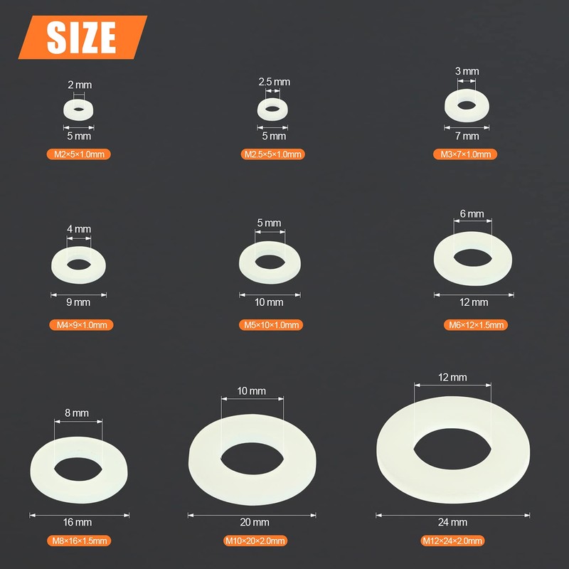 - 【Sizes】M2 M2.5 M3 M4 M5 M6 M8 M10 M12, total 800 pieces/9 sizes of the most commonly used nylon washers in a plastic case, different size can satisfy your different needs.
