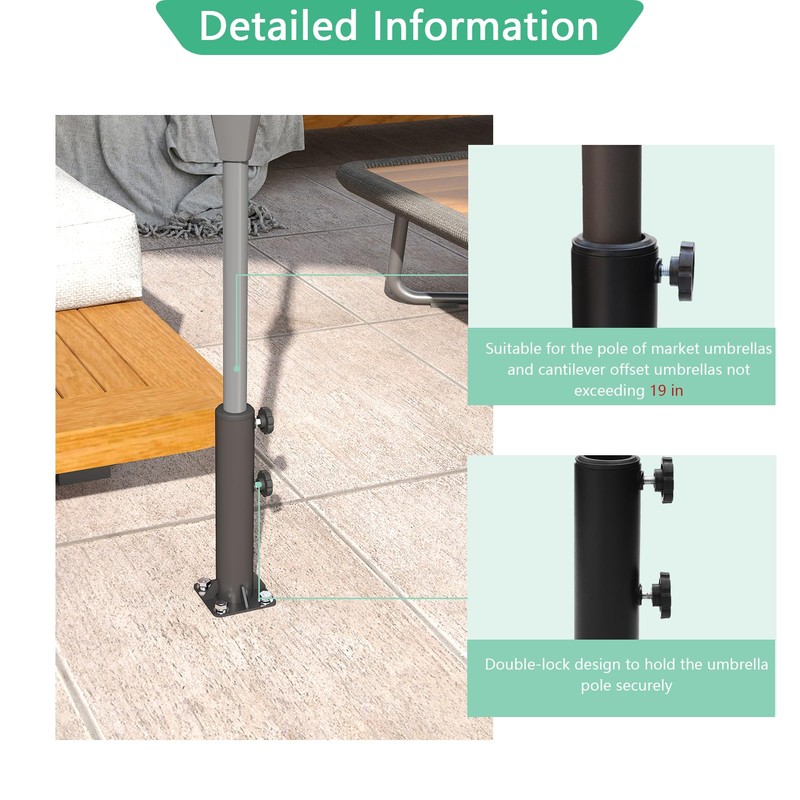 - Flexible design: fits all kinds of market umbrellas and cantilever offset umbrellas with 1.3"(32mm), 1.5" (38mm) and 1.9"(48mm) pole diameter, equipped with two types of screws, universal for concrete and wooden ground