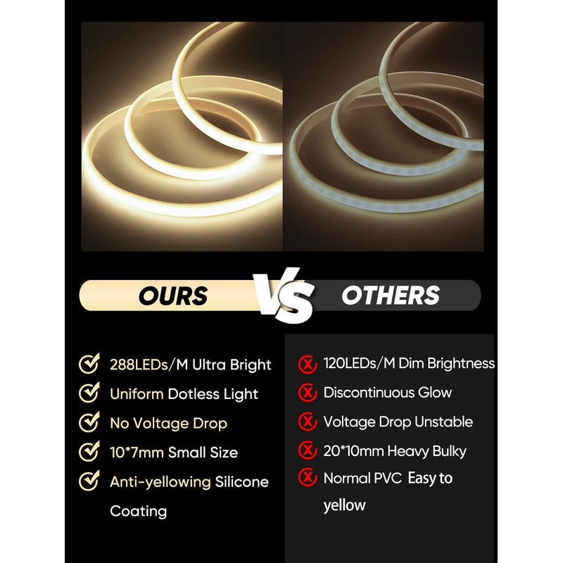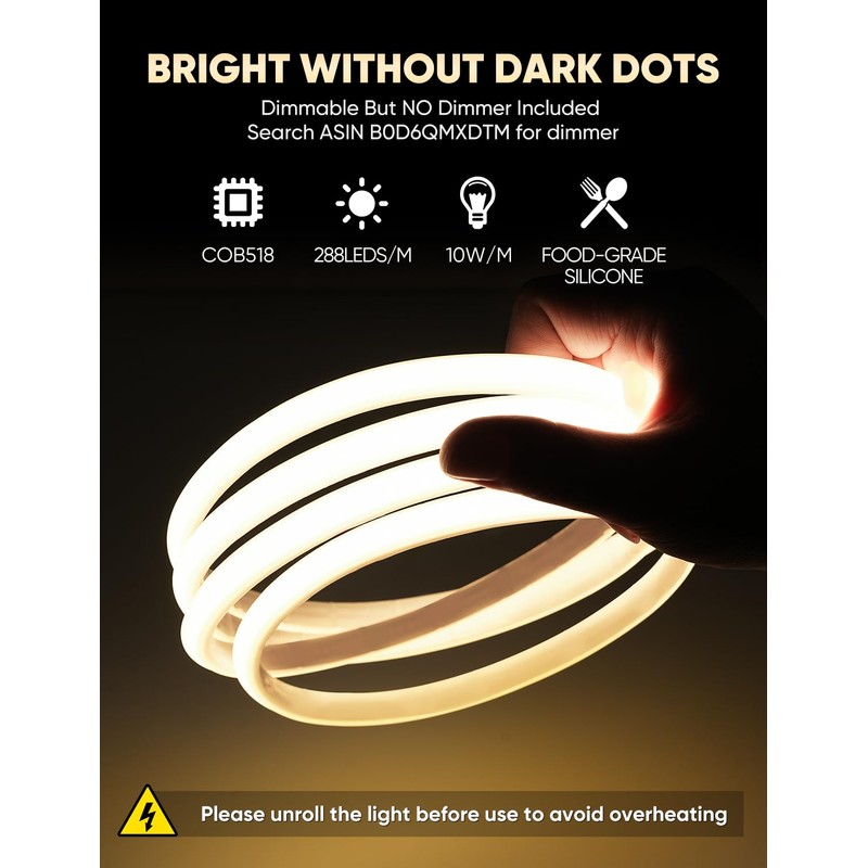 - Bright Exceptional Luminance: Our top-view COB neon strip light is encased in flexible food-grade silicone tube, ensuring a more uniform light distribution without any dark spots. 288LEDs/M high-density design results in super brightness in 600LM per meter. This 120V COB light strip has no voltage drop, with 164 ft max. run length by a single power cord. Please unroll the light strip before use to avoid overheating and melting