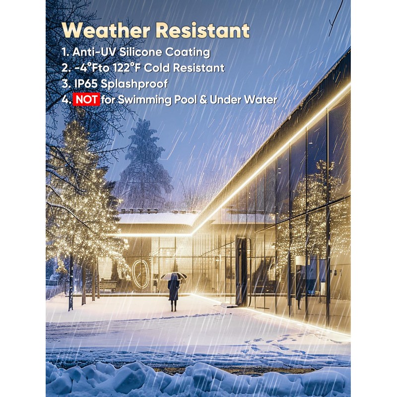 - Outdoor-Ready and Weather Resistant: The neon rope light is IP65 splash-proof and functions effectively from -4℉ to 122℉. To ensure long-lasting light, seal all connections and the end cap with silicone glue, and keep the power cord, connections and ends in a waterproof enclosure. It's perfect for enhancing outdoor landscape and architectural features such as windows, roofs, patios, gardens, backyards and decks. However, it can not be used underwater or near pool